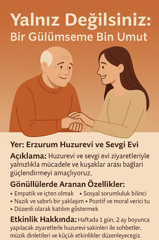 “Yalnız Değilsiniz” etkinliği, Erzurum’daki huzurevi sakinlerini ziyaret ederek, onların yaşamlarına sıcak bir dokunuş yapmayı, gençlerin toplumsal duyarlılığını artırmayı ve kuşaklar arası sevgi bağlarını güçlendirmeyi amaçlamaktadır. Bu etkinlik; yalnızlık hissiyle mücadele eden, sevgiye ve paylaşıma ihtiyaç duyan yaşlı bireylerle gönüllü gençleri bir araya getirerek iyileştirici bir sosyal köprü kurmayı hedefler. Katılımcılar, empati kurmayı, toplumsal sorumluluk bilincini ve insani değerleri derinden deneyimleyeceklerdir. 1. Sosyal Etkileşim ve İletişim Gönüllüsü Huzurevi sakinleriyle birebir sohbetler gerçekleştirerek onların kendilerini ifade etmelerini sağlamak. Yaşlı bireylerin geçmiş anılarını, yaşam deneyimlerini dinleyerek değerli hissetmelerine katkı sunmak. Duygusal destek sağlamak ve yalnızlık hissini azaltacak sıcak bir iletişim ortamı kurmak. 2. Etkinlik ve Moral Organizasyonu Gönüllüsü Ziyaret günleri için mini etkinlikler (şiir okuma, türkü söyleme, hikâye anlatımı, doğum günü kutlaması vb.) planlamak. Huzurevi sakinleriyle birlikte el sanatları, boyama ya da küçük hatıra kartları gibi yaratıcı aktiviteler yürütmek. Etkinlik sırasında ortamın neşeli, pozitif ve dahil edici olmasını sağlamak. 3. Kültürel Paylaşım ve Müzik Gönüllüsü Bağlama, gitar veya vokal eşliğinde küçük müzik dinletileri düzenlemek. Halk türkülerinden seçilmiş eserlerle kültürel bağ kurmak. Gönüllü grup içinden yeteneği olan bireylerin performanslarını organize etmek. 4. Fotoğraf ve İletişim Gönüllüsü Ziyaretlerin fotoğraf ve kısa video kayıtlarını almak, etkinlik anılarını belgelemek. Etkinlik sonrasında kullanılacak kısa tanıtım videosu veya “Birlikte Hatırladık” köşesi için içerik hazırlamak. Etkinliğin görünürlüğünü artıracak afiş, pano ya da sosyal medya duyurularına destek vermek. 5. Koordinasyon ve Takip Gönüllüsü Haftalık görev dağılımını gönüllüler arasında organize etmek. Ziyaret günleri için katılım listesini ve görev planını hazırlamak. Huzurevi yönetimiyle iletişimi sürdürmek, etkinlik günlerinin planlı ilerlemesini sağlamak. Gönüllülerin Sağlayacağı Fayda ve Katkılar 🤝 Sosyal Fayda Huzurevi sakinlerinin yalnızlık hissini azaltır, onlara moral ve sosyal destek sağlar. Gençlerin toplumsal duyarlılık bilincini artırır ve kuşaklar arası iletişimi güçlendirir. 💬 Duygusal Fayda Katılımcı yaşlıların kendilerini değerli, görülmüş ve hatırlanmış hissetmelerini sağlar. Gönüllülerde empati, sabır ve hoşgörü gibi insani değerlerin gelişimini destekler. 🌼 Toplumsal Fayda Yerel toplulukta gönüllülük bilincinin yaygınlaşmasına katkıda bulunur. Erzurum Kız Yurdu öğrencilerinin topluma aktif katkı sağlayan bireyler hâline gelmesini teşvik eder. 🎨 Kültürel Fayda Halk müziği, geleneksel değerler ve sözlü kültür aracılığıyla kuşaklar arası bağ kurulur. Yaşlı bireylerin kültürel birikimleri kayıt altına alınarak sosyal hafızaya katkı sağlanır. Gönüllülerde Aranan Özellikler 🌼 Kişisel Nitelikler • Empati kurabilen, dinlemeyi bilen, samimi ve içten • Sosyal sorumluluk bilincine sahip • Yaşlı bireylerle iletişimde nazik ve sabırlı • Duygusal olgunluk sahibi, güven veren bir tutumda • Pozitif enerji taşıyan, moral verici bir yaklaşım sergileyen 💪 Gönüllülük Becerileri • Grup çalışmasına ve işbirliğine açık • Etkinlik sırasında aktif görev alabilecek (müzik, iletişim, fotoğraf vb.) • Kültürel değerlere ve toplumsal saygıya özen gösteren • Ziyaretlerin sürekliliğini sağlayabilecek (haftada 1 gün düzenli katılım) Etkinlik Yeri ve Süresi Yer: Erzurum Huzurevi ve Sevgi Evi Süre: Etkinlik, ay boyunca planlanmıştır. Ziyaretler haftada 1 gün, 2 saat sürecektir. Toplamda 8 hafta (16 saat) boyunca düzenli olarak yapılacak, her ziyarette farklı sosyal ve duygusal etkinlikler gerçekleştirilecektir.