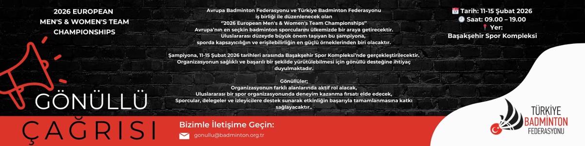 Avrupa Badminton Federasyonu ve Türkiye Badminton Federasyonu iş birliği ile İSTANBULDA düzenlenecek olan "2026 European Men's & Women's Team Championships" Uluslararası düzeyde Avrupa'nın bir çok elit sporcusunu bir araya getirecektir. Uluslararası düzeyde büyük önem taşıyan bu şampiyona 11-15 Şubat 2026 tarihlerinde arasında Başakşehir Spor Kompleksi'nde gerçekleştirilecektir. Gönüllüler organizasyonun farklı alanlarında aktif rol alarak Uluslararası bir spor organizasyonunda deneyim kazanma fırsatı elde edecek Uluslararası spor organizasyonlarında saha operasyonları, sporcu ve delegasyon desteği, akreditasyon, lojistik, iletişim ve protokol hizmetlerinde gönüllü olarak görev almak. Organizasyon öncesi ve etkinlik süresince saha operasyonlarına destek Yarışma alanlarının düzeni ve kontrolü Program akışının takibi ve koordinasyon Protokol misafirlerinin karşılanması VIP alan düzeni ve yönlendirme Resmî program akışına destek Yerli ve yabancı sporcuların karşılanması ve yönlendirilmesi Takım ihtiyaçlarının organizasyon birimlerine iletilmesi Sporcu alanlarının düzeni ve erişim kontrolü Yabancı delegasyonlar, hakemler ve misafirlerle iletişim Akreditasyon ve karşılama süreçlerinde görev alma Temel seviyede yabancı dil ile iletişim desteği Yaş şartı: 18 yaşını doldurmuş olmak İyi derece İngilizce bilmek gönüllü için büyük artı İyi derece teknoloji bilgisi kamera, yayın, bilgisayar kullanımı gönüllü için büyük artı Çalışma süresi: Etkinlik öncesi hazırlık, etkinlik günleri ve gerekirse sonrası için uygun olmak. Sorumluluk bilinci: Verilen görevleri zamanında ve eksiksiz yerine getirmek. Ekip çalışmasına uygunluk: Diğer gönüllüler ve görevlilerle uyum içinde çalışabilmek. İletişim becerisi: Katılımcılar, misafirler ve ekiple doğru iletişim kurabilmek. Kurallara uyum: Organizasyonun belirlediği kural ve yönergeleri kabul etmek. Disiplin ve güvenilirlik: Görev saatlerine riayet etmek, güvenilir davranmak. Sağlık durumu: Göreve engel teşkil edecek bir sağlık sorununun bulunmaması. Gönüllüler turnuva boyunca görev alacaklardır. Vardiyalı çalışma sistemi uygulanacaktır. Ortalama 5 saat çalışma süresi olacaktır. Gönüllülere yemek verilecektir. Gönüllülere katılım belgesi verilecektir. İngilizce ve Teknoloji bilgisi iyi olan gönüllü adaylarımıza öncelik verilecektir. ORGANİZSYON İSTANBULDA DÜZENLENECEK , gonullu@badminton.org.tr buradan ulaşabilirsiniz.