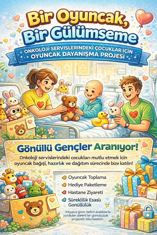 Özgecan Aslan Gençlik Merkezi olarak; hastanelerin onkoloji servislerinde tedavi gören çocuklara moral vermek, onların oyunla bağlarını güçlendirmek ve tedavi süreçlerinde kendilerini daha iyi hissetmelerine katkı sağlamak amacıyla süreklilik taşıyan bir oyuncak dayanışma çalışması yürütülmektedir. Bu faaliyet, tek seferlik bir etkinlikten ziyade düzenli olarak devam eden, gönüllülük temelli bir sosyal sorumluluk projesi olarak planlanmıştır. Gençlik merkezimiz bünyesinde oluşturulan oyuncak toplama kutuları aracılığıyla toplanan oyuncaklar; • kontrol edilmekte, • temizlik ve bakım süreçlerinden geçirilmekte, • hediye paketi haline getirilmekte ve belirli aralıklarla hastanelerin onkoloji servislerinde tedavi gören çocuklara ulaştırılmaktadır. Proje süreci; toplama, hazırlık ve dağıtım aşamalarından oluşan düzenli bir sistem içinde yürütülmektedir. Gönüllülerden Beklenen Görevler • Oyuncak toplama sürecine destek olmak, • Toplanan oyuncakların bakım ve düzenleme çalışmalarında görev almak, • Hediye paketlerinin hazırlanmasına katkı sağlamak, • Hastanelerde gerçekleştirilen dağıtım süreçlerinde destek olmak. Gönüllülere Sağlayacağı Katkılar (Faydalar) • Sürekliliği olan bir sosyal sorumluluk projesinde yer alma, • Çocuklara yönelik gönüllülük çalışmalarında deneyim kazanma, • Toplumsal dayanışma ve empati bilincini güçlendirme, • Gençlik merkezi gönüllülük faaliyetlerine aktif katılım. Gönüllü başvurusu yapacaklarda aranan özellikler; • Tercihen üniversitelerin Okul Öncesi Öğretmenliği bölümlerinde okuyan veya mezun, • Daha önce gönüllülük çalışmalarında yer almış (tercih sebebidir), • Çocuklarla çalışmaya istekli, sorumluluk sahibi ve ekip çalışmasına uyumlu genç gönüllüler. Uygulama sıklığı: Oyuncak toplama, hazırlık ve dağıtım çalışmaları ayda en az 1 kez gerçekleştirilecektir. İhtiyaca göre bu sıklık artırılabilecektir. Çalışma süresi: Her uygulama günü gönüllüler için ortalama 3 saatlik bir çalışma öngörülmektedir. Gönüllü katılım şekli: Gönüllüler; • oyuncak toplama, • bakım & paketleme, • dağıtım aşamalarından en az birine dahil olarak projeye katkı sağlayabilecektir. Esneklik: Gönüllülerden her aşamaya katılım beklenmemektedir. Uygunluk durumlarına göre gönüllü planlaması yapılacak, görev dağılımı önceden bildirilecektir.